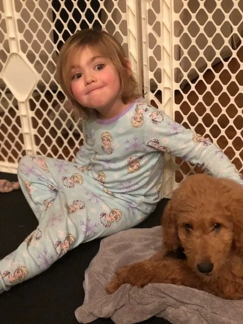 Our girl was born on 5/21/21. In the 8 weeks while she remained with her mom and littermates, we were provided consistent photo updates, training information, general puppy advice, a recommended supply list, and even had a Zoom call to meet the pups! Rosie was so well taken care of in these weeks - loved by the Harrington family, cuddled by their kiddos, and given the proper veterinarian care that a puppy requires. Her mom, Penny, had such a great temperament and was proud to show off her pups too.